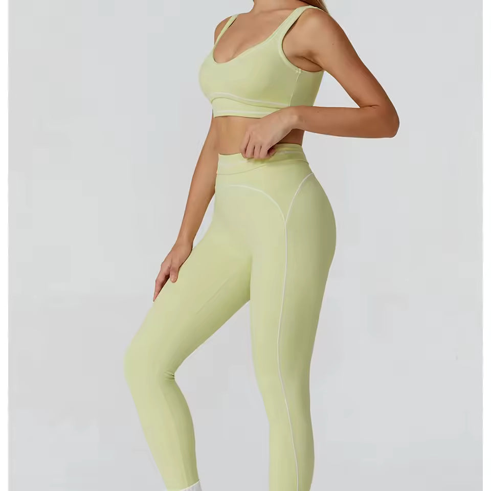 Conjunto de yoga feminino de 2 peças com contraste de cores, composto por sutiã desportivo e leggings de cintura alta, ideal para treino, corrida e fitness.
